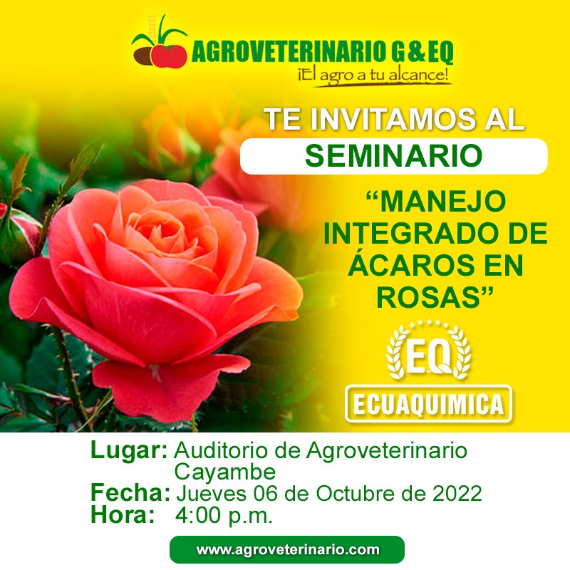 Asiste y conoce más sobre el MANEJO INTEGRADO DE ÁCAROS Y ROSAS, te invitamos a esta charla espectacular gracias a ECUAQUÍMICA Y AGROVETERINARIO GYEQ te esperamos en el Auditorio de Agroveterinario de Cayambe el día jueves 06 de octubre a las 4pm.